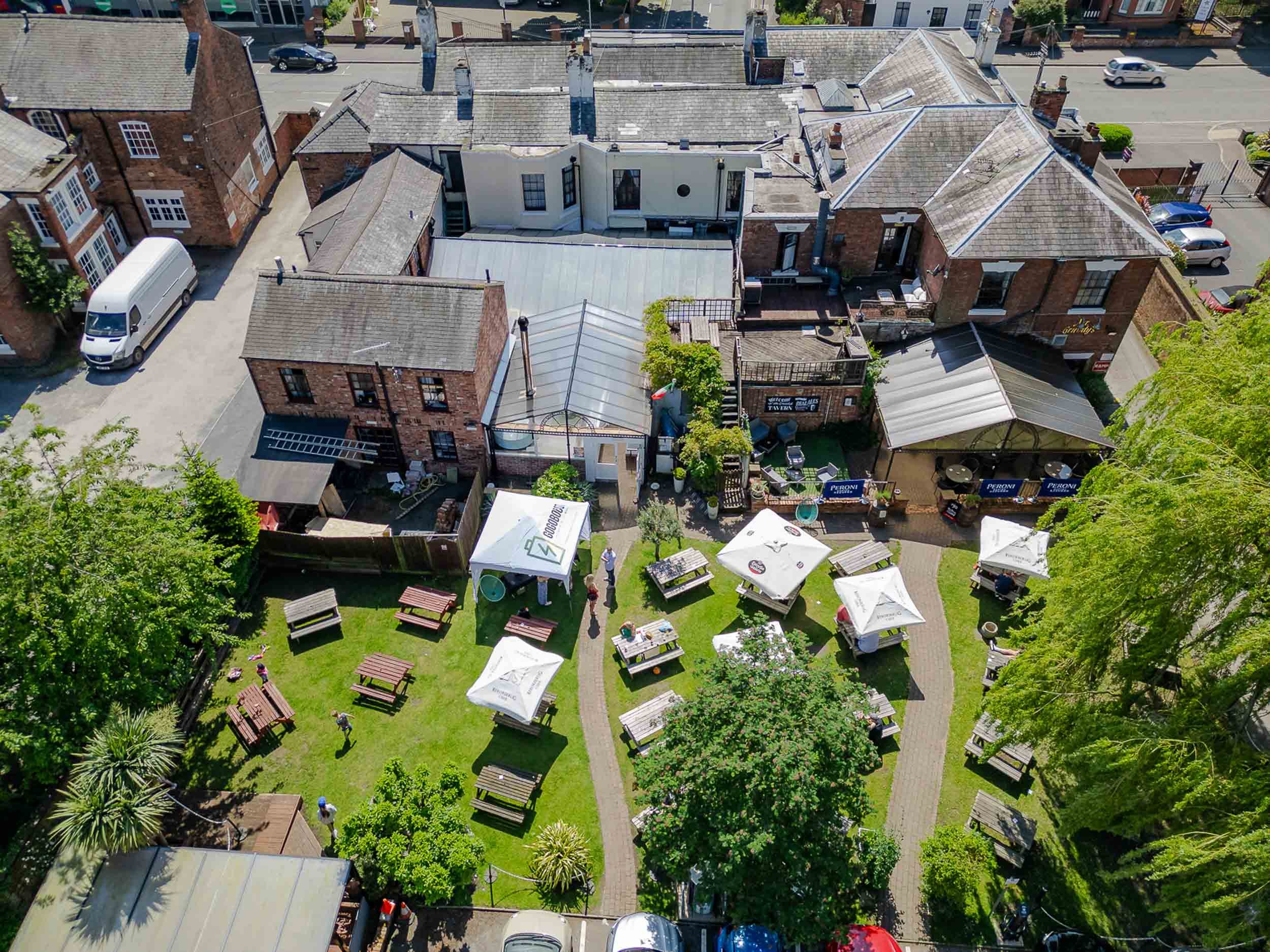 A top-down drone shot at a summer fete showcasing what’s on offer